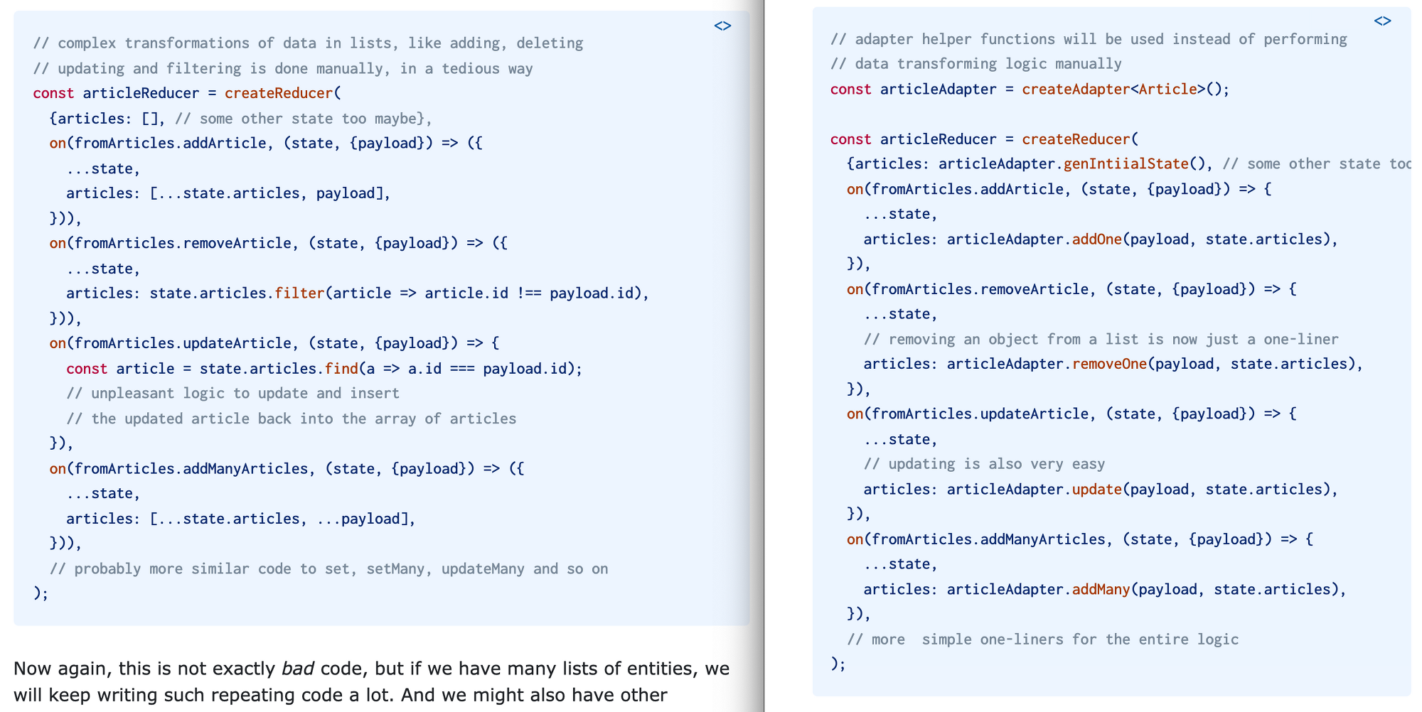 entity를 쓰지 않은 리듀서와 entity를 사용한 리듀서이다.